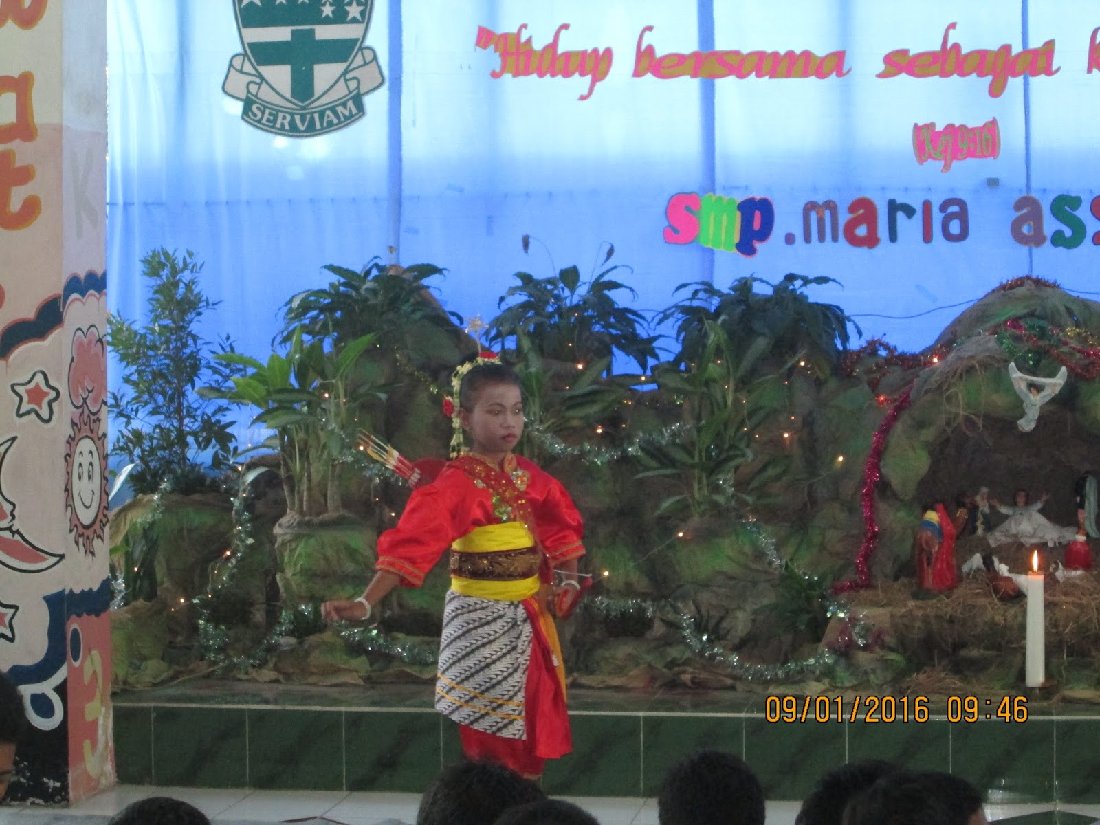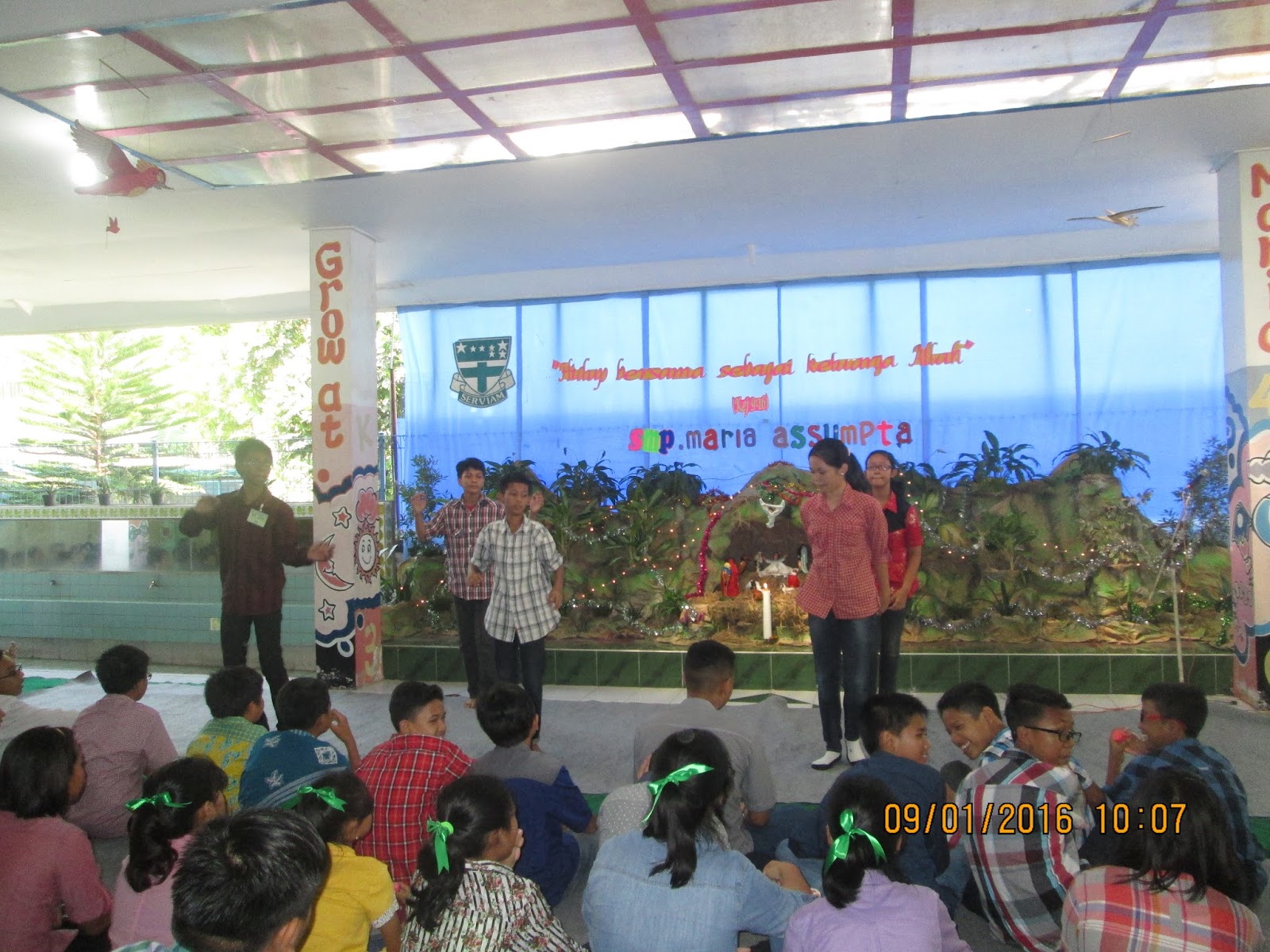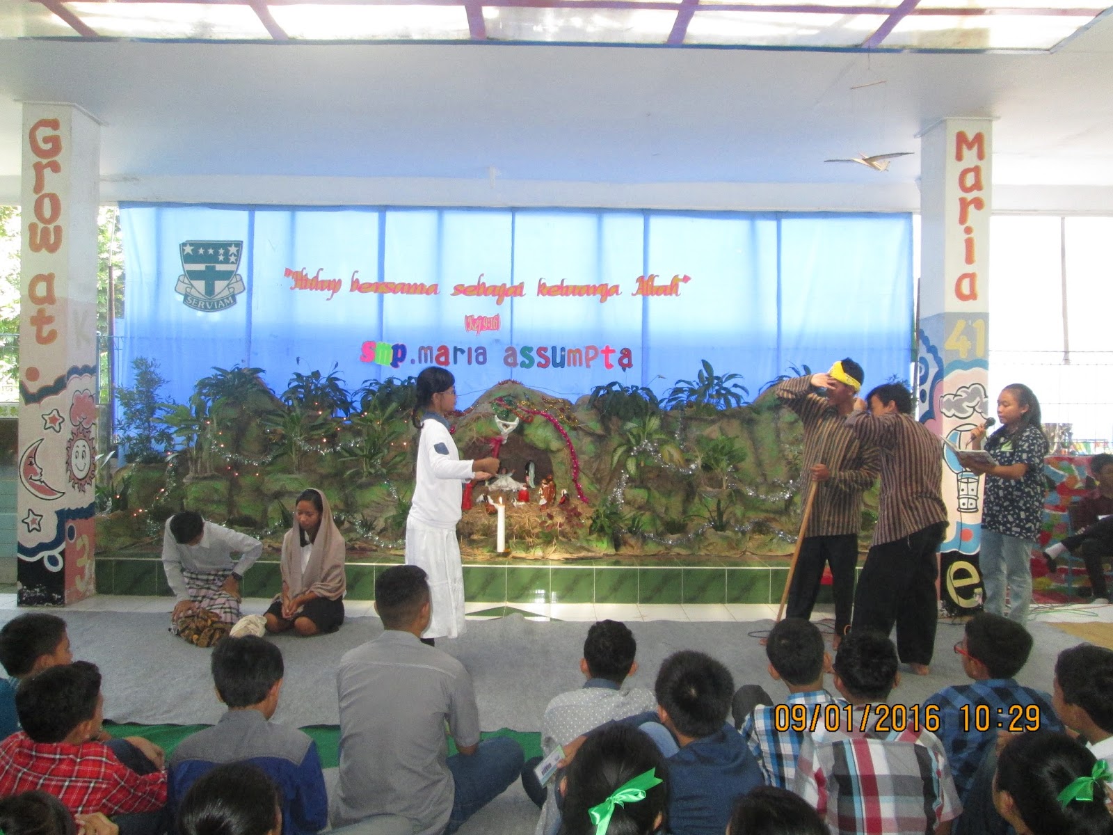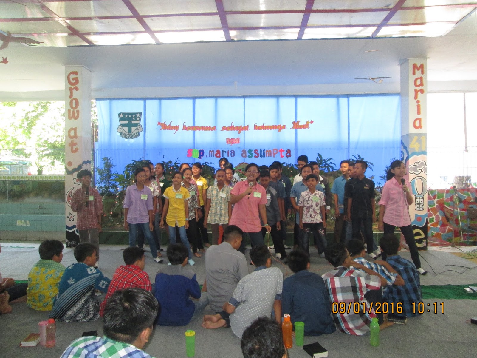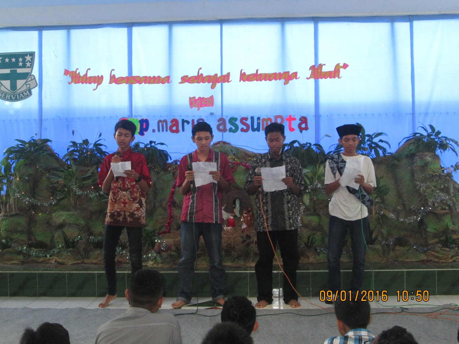 Hai sobat bisma yang terkasih, hari ini Sabtu tanggal 9 Januari 2016 sekolah kita SMP Maria Assumpta mengadakan perayaan natal menyambut kelahiran Sang Juruselamat Tuhan Yesus Kristus yang diselenggarakan di aula TK Maria Assumpta dengan pembawa firman Romo Slamet.