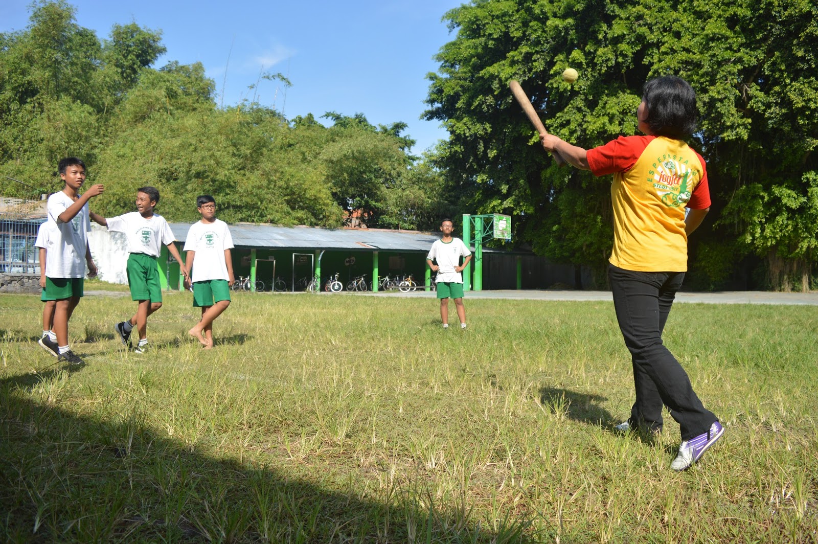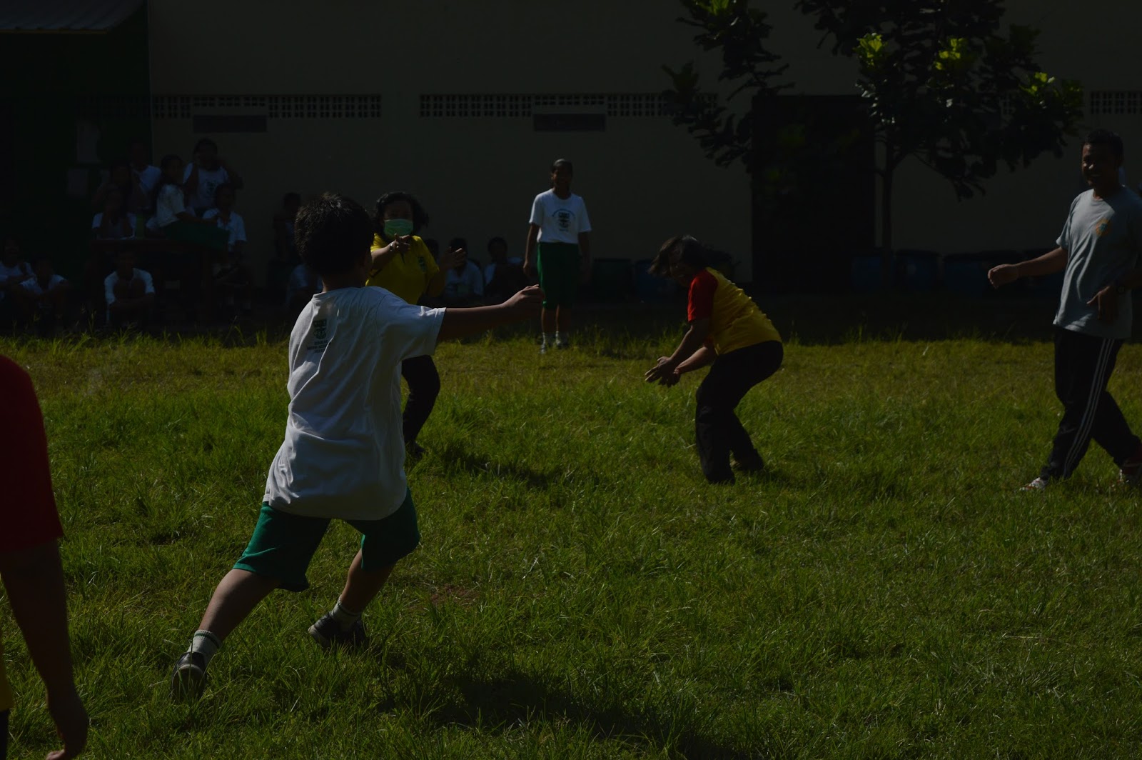 | Aksi pembalasan kekalahan tim guru oleh Bu Nita dengan lemparan tangan kirinya sedikit menyerempet pemain lawan |