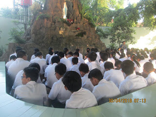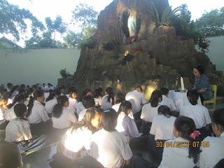 Senin (30/4). Seluruh warga SMP Maria Assumpta memenuhi Gua Maria Kampus