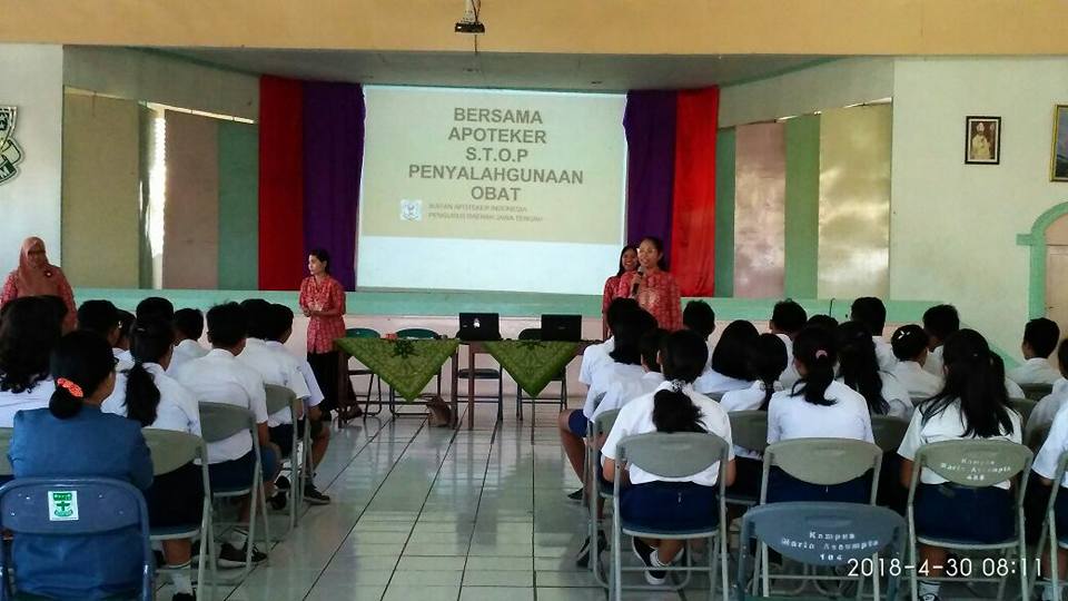 Senin (30/4), SMP Maria Assumpta mendapatkan penyuluhan tentang penggunaan dan penyimpanan obat-obatan secara benar dari Ikatan Apoteker Indonesia cabang Klaten yang diikuti oleh siswa kelas 9 SMP Maria Assumpta di aula kampus Maria Assumpta.