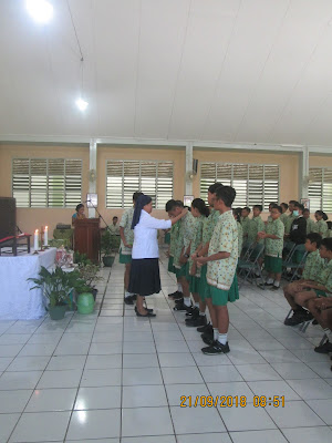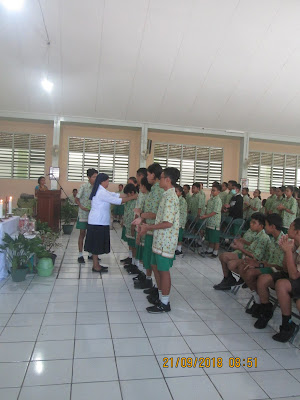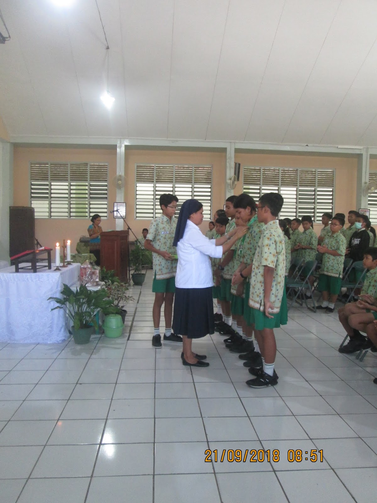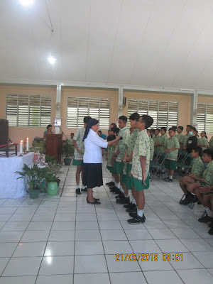 Pukul 09.00, misa pelantikan OSIS dan anggota Dewan Penggalang periode 2018/2019 selesai dilaksanakan.