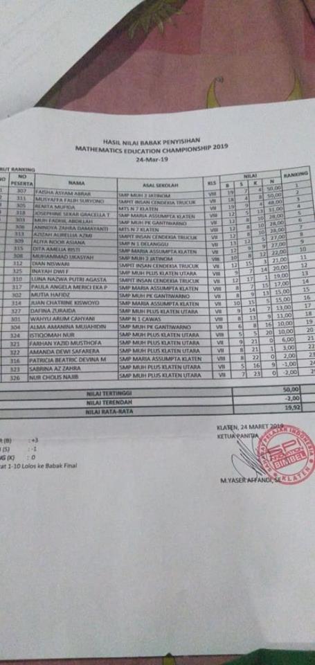 Sekar, Amel, Katrin, Angel, dan Beatrice mewakili SMP Maria Assumpta Klaten mengikuti kompetisi Matematika tingkat kabupaten Klaten di SMP Muhammadiyah Plus Klaten. Dua diantara mereka lolos maju ke babak final, yaitu Josephine Sekar (8C) dan Dita Amelia Kristi (7C). Selamat ya..